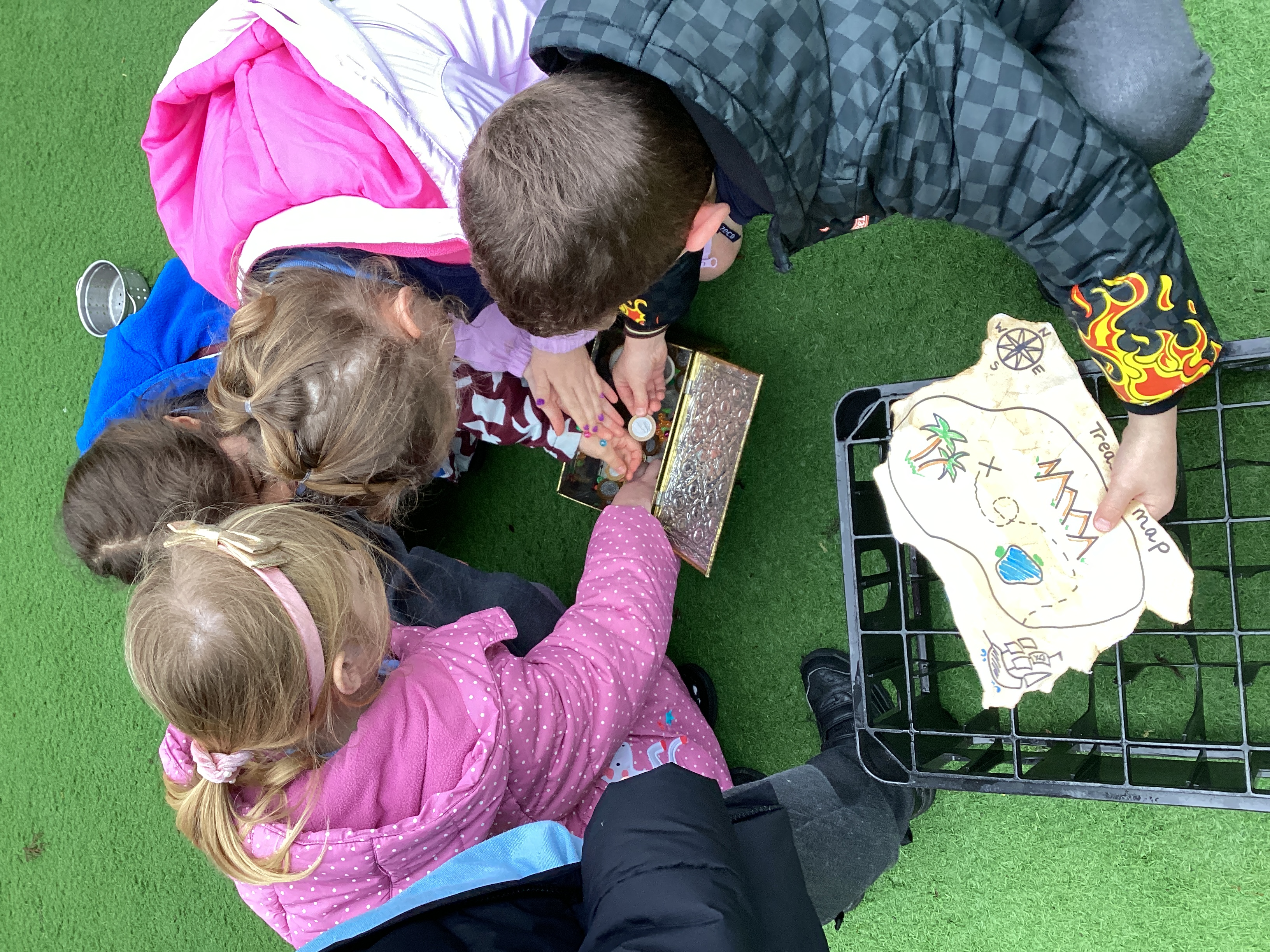 We found a treasure map and followed it. At the end we found a treasure chest with lots of treasure inside.
